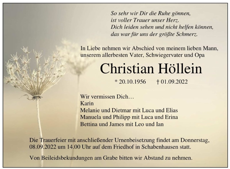 in dieser Zeit des Schmerzes wünschen wir Ihnen Kraft, den Verlust im Kreise Ihrer Liebsten zu verarbeiten. Als Zeichen unserer Anteilnahme und des Gedenkens entzünden wir dieses erste Licht. Möge diese Gedenkseite Ihnen helfen, Erinnerungen zu teilen und so das Andenken gemeinsam wachzuhalten.