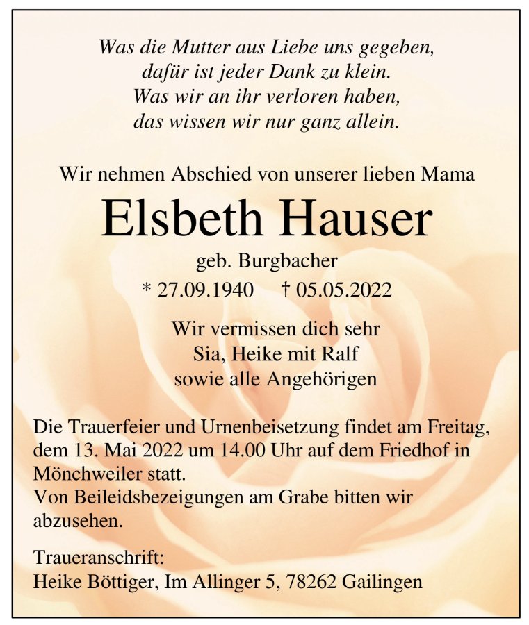 Elsbeth Hausergestorben am 5. Mai 2022