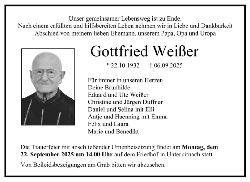 wir wünschen Ihnen für die kommende Zeit viel Kraft und dass es Ihnen gelingt, dankbar auf die positiven Erinnerungen zurückzublicken. Diese Gedenkseite möge Ihnen dabei helfen, Ihre Trauer zu teilen und das Andenken gemeinsam wachzuhalten.