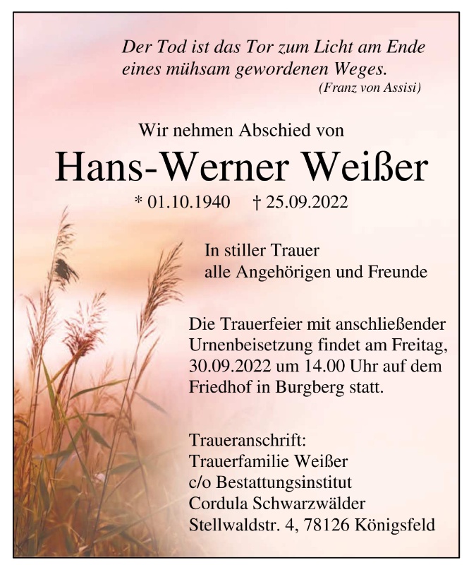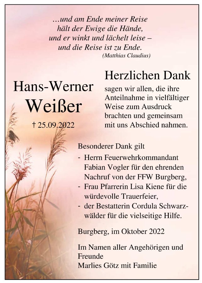 in diesen Tagen fühlen wir mit Ihnen und wünschen Ihnen von Herzen, dass Sie aus den glücklichen Erinnerungen Kraft schöpfen, um positiv in die Zukunft zu gehen. Diese Gedenkseite möge Ihnen dabei helfen, Ihre Trauer zu teilen und das Andenken gemeinsam wachzuhalten.