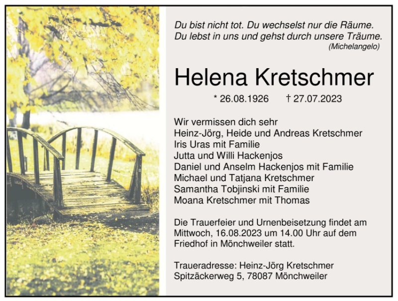 wir wünschen Ihnen von Herzen viel Kraft, dass Sie Menschen um sich haben, die Ihnen in dieser schweren Zeit beistehen und Halt geben. Zusätzlich können Sie auf dieser Gedenkseite Erinnerungen teilen und so das Andenken gemeinsam wachhalten.
