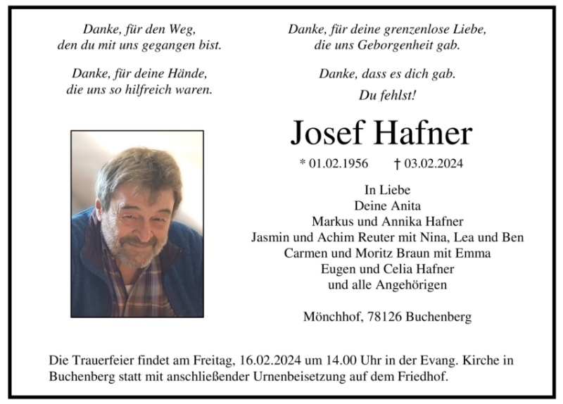 wir wünschen Ihnen für die kommende Zeit viel Kraft und dass es Ihnen gelingt, dankbar auf die positiven Erinnerungen zurückzublicken. Diese Gedenkseite möge Ihnen dabei helfen, Ihre Trauer zu teilen und das Andenken gemeinsam wachzuhalten.