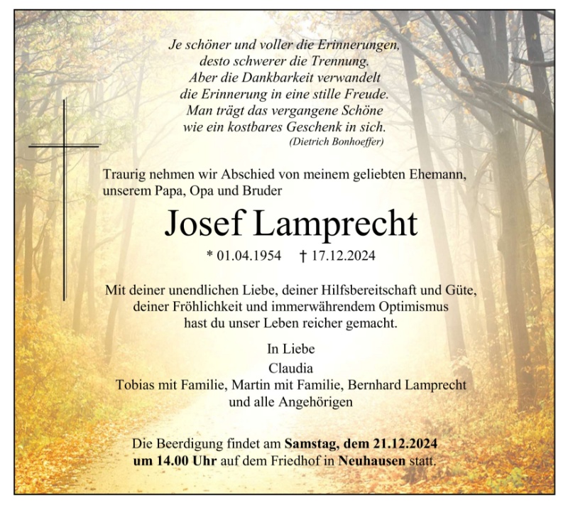 wir wünschen Ihnen von Herzen viel Kraft, dass Sie Menschen um sich haben, die Ihnen in dieser schweren Zeit beistehen und Halt geben. Zusätzlich können Sie auf dieser Gedenkseite Erinnerungen teilen und so das Andenken gemeinsam wachhalten.