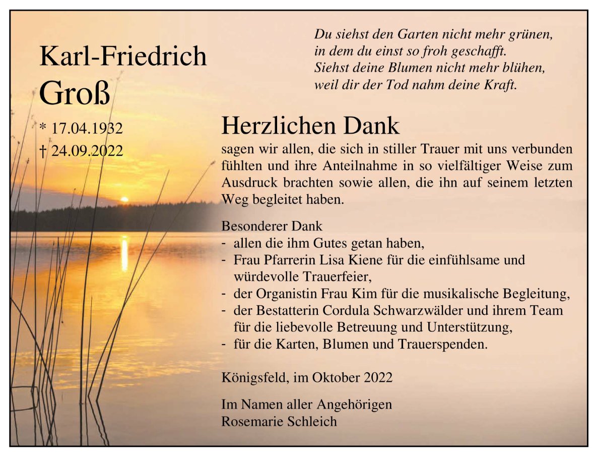 in dieser Zeit des Schmerzes wünschen wir Ihnen Kraft, den Verlust im Kreise Ihrer Liebsten zu verarbeiten. Als Zeichen unserer Anteilnahme und des Gedenkens entzünden wir dieses erste Licht. Möge diese Gedenkseite Ihnen helfen, Erinnerungen zu teilen und so das Andenken gemeinsam wachzuhalten.