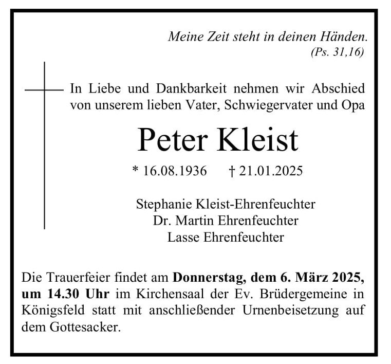 in diesen Tagen fühlen wir mit Ihnen und wünschen Ihnen von Herzen, dass Sie aus den glücklichen Erinnerungen Kraft schöpfen, um positiv in die Zukunft zu gehen. Diese Gedenkseite möge Ihnen dabei helfen, Ihre Trauer zu teilen und das Andenken gemeinsam wachzuhalten.