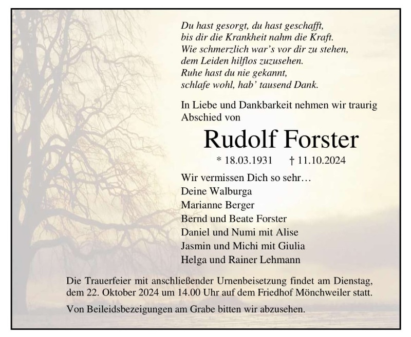 wir wünschen Ihnen von Herzen viel Kraft, dass Sie Menschen um sich haben, die Ihnen in dieser schweren Zeit beistehen und Halt geben. Zusätzlich können Sie auf dieser Gedenkseite Erinnerungen teilen und so das Andenken gemeinsam wachhalten.