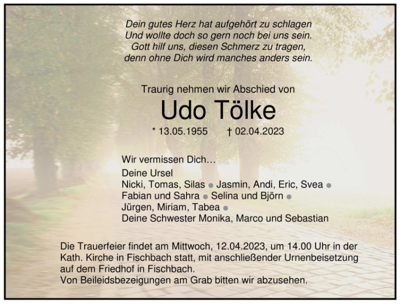 wir wünschen Ihnen von Herzen viel Kraft, dass Sie Menschen um sich haben, die Ihnen in dieser schweren Zeit beistehen und Halt geben. Zusätzlich können Sie auf dieser Gedenkseite Erinnerungen teilen und so das Andenken gemeinsam wachhalten.