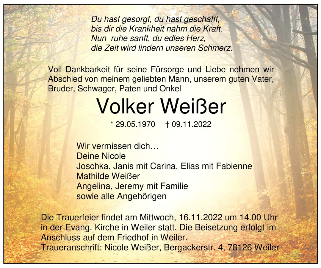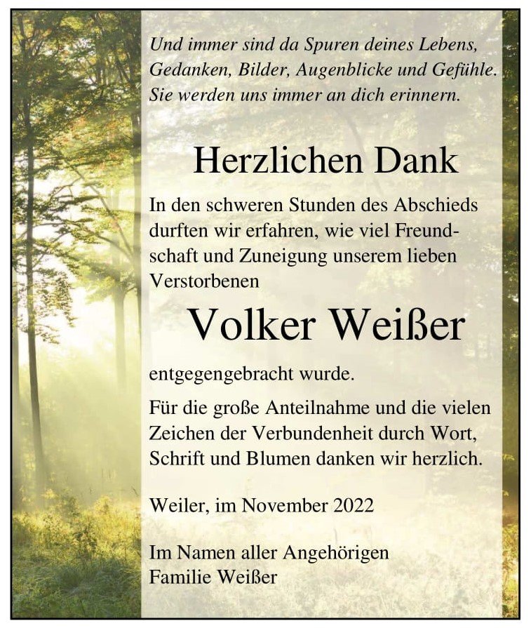 wir wünschen Ihnen von Herzen viel Kraft, dass Sie Menschen um sich haben, die Ihnen in dieser schweren Zeit beistehen und Halt geben. Zusätzlich können Sie auf dieser Gedenkseite Erinnerungen teilen und so das Andenken gemeinsam wachhalten.